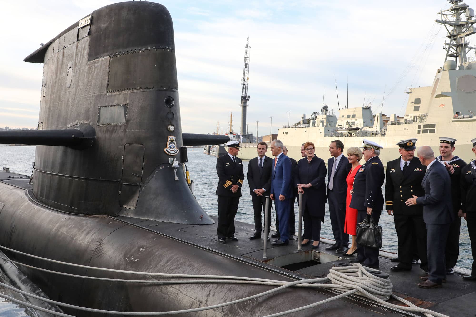 Macron and Turnbull visit the HMAS Waller, a Collins-class submarine, in Sydney. Photo credit: Ludovic Marin/Abaca Press