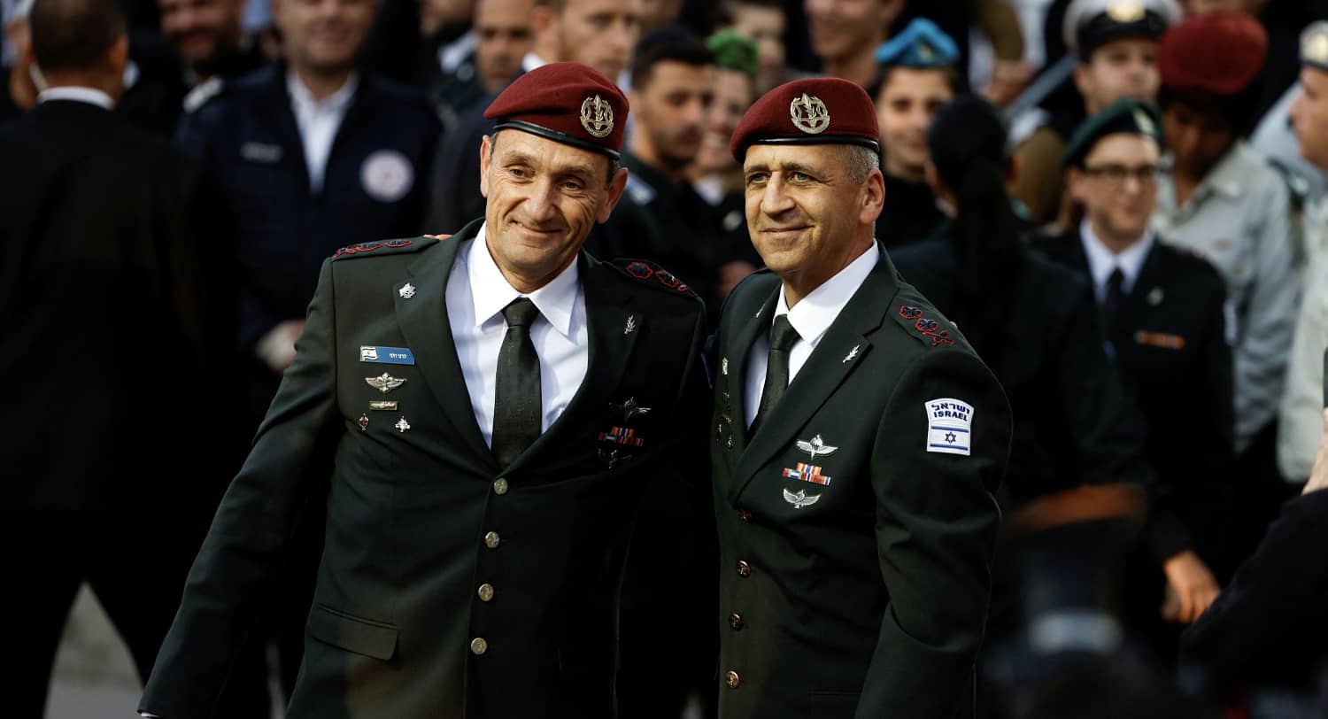 IDF Chief of Staff Hertzi Halevi (on left) with his predecessor Aviv Kochavi. Photo credit: REUTERS/Amir Cohen.